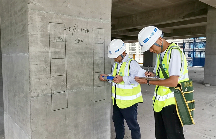 上午10點(diǎn),項(xiàng)目部管理人員組成的實(shí)測(cè)實(shí)量小組在項(xiàng)目一標(biāo)段2棟6層集結(jié)完畢,分為四組進(jìn)行實(shí)測(cè)實(shí)量現(xiàn)場(chǎng)展示。第一小組使用回彈儀,檢測(cè)混凝土強(qiáng)度;第二小組使用2米工程檢測(cè)尺、工程塞尺對(duì)墻體垂直平整度進(jìn)行測(cè)量;第三小組一手推動(dòng)外觀神似玩具車(chē)的鋼筋保護(hù)層檢測(cè)儀,一手拿著數(shù)據(jù)顯示儀監(jiān)測(cè)數(shù)據(jù),檢測(cè)地面、墻面鋼筋保護(hù)層厚度是否符合要求;項(xiàng)目技術(shù)負(fù)責(zé)人使用樓板厚度檢測(cè)儀檢測(cè)樓層板厚。