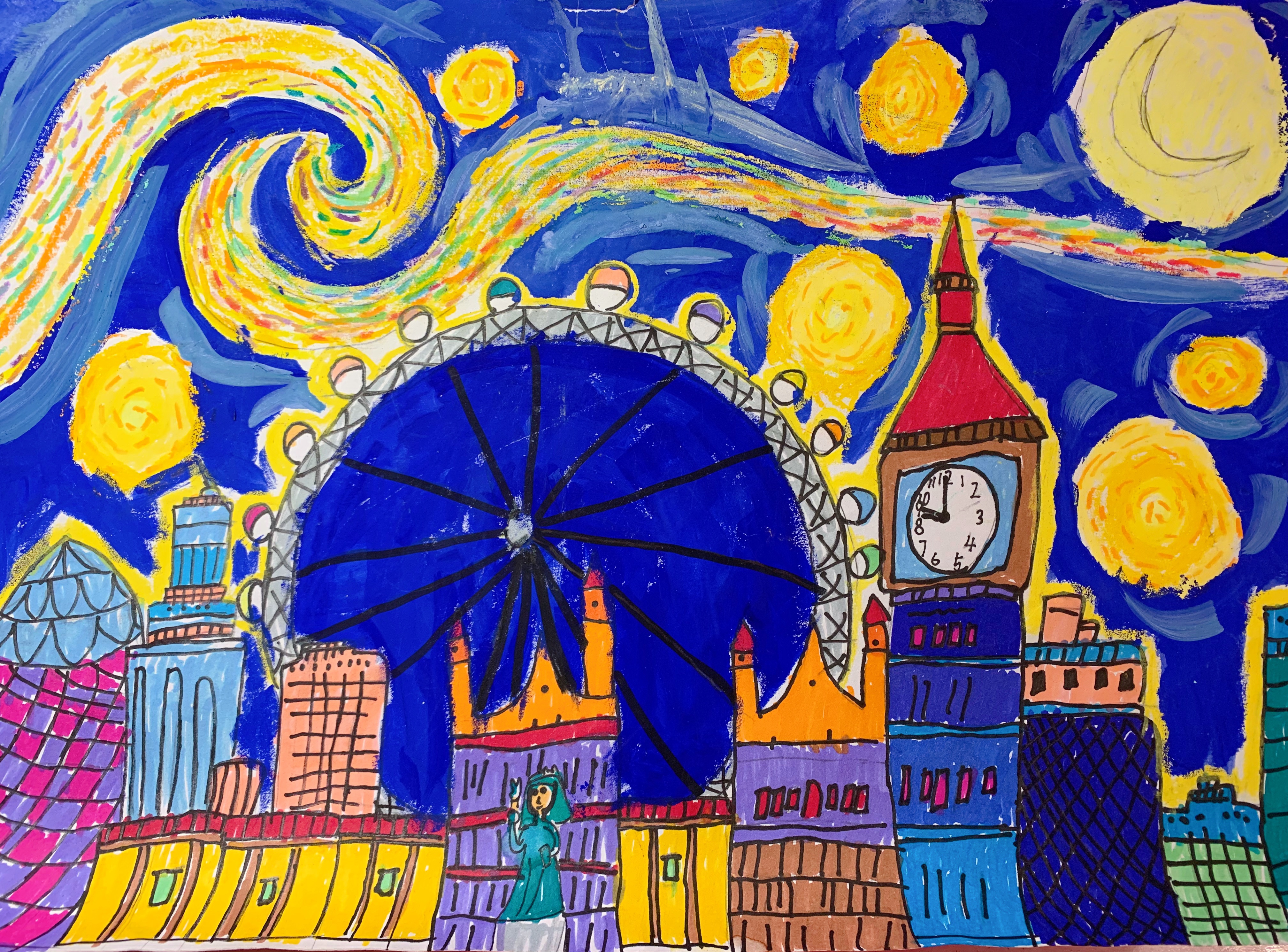 寓意:此畫是小作者根據(jù)梵高的《星月夜》所創(chuàng)。小作者通過《星月夜》得到靈感,用了漸變藍(lán)色系的月光色和彩虹般絢爛的煙花,明亮的月光,還有照耀世界的自由女神像,明亮又充滿人間煙火氣的溫暖的樓宇和房屋,還有小作者喜歡的彩色摩天輪勾畫了屬于她心中美好的《城市月夜》。雖然不同的人面對(duì)梵高的《星月夜》這幅曠世之作會(huì)有不同的理解,雖然誰也無法弄清楚梵高真正的創(chuàng)作意圖,但是他帶給我們對(duì)繪畫表現(xiàn)手法的探索與執(zhí)著,給予了我們無限的思索和啟迪。