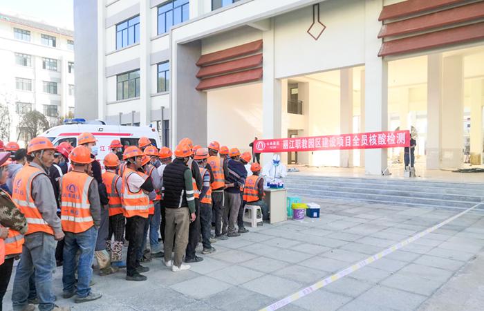 在此過程中,麗江職教園區(qū)項目部積極組織管理人員、在場施工工人和項目部后勤人員共251人進(jìn)行核酸采集,工人們井然有序地排隊配合醫(yī)護(hù)人員進(jìn)行核酸采集。