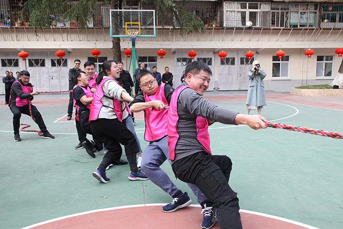 在 “蜈蚣”運球游戲中,穿著五彩隊衣的職工們與彩色的瑜伽球交相輝映,如行走的色彩在原本單一的球場上筆筆流動,偶爾一個小失誤球掉了,隊員們互相鼓勵著,把五個球運送到目的地;在超級障礙賽中,參賽者們時而“翻山越嶺”、時而“匍匐前行”,接力棒在隊友間快速地傳遞著;在“歡樂龍舟”游戲中中,隊員們快速地穿梭在賽道上,到達終點時都不約而同地大喘氣,嘴里還不停說著“太累了”,但是在完成的那一刻都歡呼雀躍起來;在摸石頭過河中,隊員們充分發(fā)揮自己的智慧與力量,“應該脫了鞋走”“應該手腳配合一步一個彩磚走”……大家激烈地討論著,在那些落后的隊伍身旁也總能看到隊友們在加油鼓勁。在多向拔河賽中,各隊伍隨著“1,2,1,2”的口號聲用力地拉扯著粗繩,緊張的氣氛下,中心線一會兒看著要落向紅色區(qū)域,轉瞬卻又落向紫色…… 元宵趣味活動在一片歡聲笑語中落下帷幕。