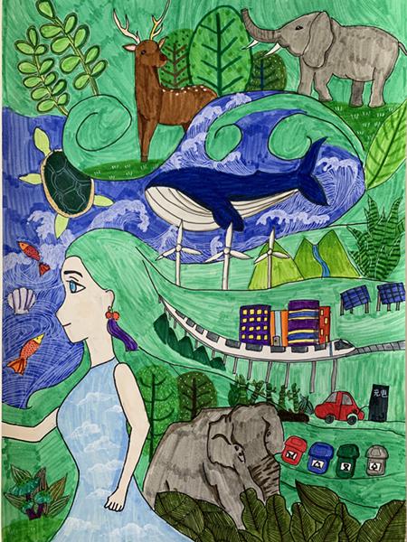 寓意:春姑娘披著一頭翠綠的長發(fā)緩緩地朝我們走來了。輕柔的暖風送來鳥兒的歡歌。各種新嫩枝葉都敞開了胸懷,有翠綠的,嫩綠的,深綠的,一起享受著這從密葉林間穿透而過的初夏的陽光。在這綠茵茵的發(fā)絲上風車隨意的轉動著一圈又一圈,青山綠草在春姑娘翠綠的發(fā)絲中探了出來,城市的新地、高樓、高鐵、充電節(jié)能小汽車、還有風力發(fā)電……一片欣欣向榮的景象沐浴著生活的陽光,在飄逸長發(fā)中搖曳。春姑娘那溫柔美好的眼神,甜甜的微笑,還有細微的眉頭,都能讓人感受到生命的美好,各種小動物、植物也都隨著他們的腳步在春光中醒來,展示著生命的可貴。