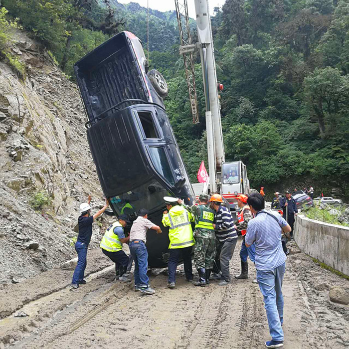 公司第四直管項目部施工的獨龍江酒店項目經(jīng)理張俊平、項目副經(jīng)理賀國春得知災(zāi)情后,積極組織動員項目部管理人員及勞務(wù)班組施工人員,調(diào)動大型起重機,第一時間趕赴受災(zāi)現(xiàn)場,配合當(dāng)?shù)卣块T對被困車輛展開搶險救援工作。