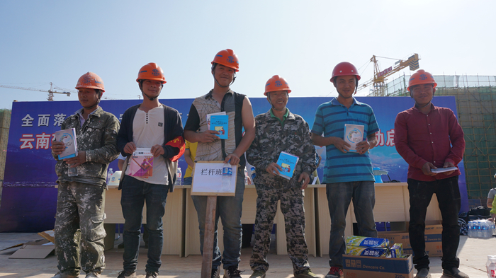 “2017年‘安全生產(chǎn)月’的主題是?”“全面落實企業(yè)主體責任”。“四不傷害是什么?”“不傷害自己、不傷害他人、不被他人傷害、保護他人不被傷害”。在現(xiàn)場的有獎安全知識搶答競賽活動中勞務班組人員及管理人員紛紛舉手搶答問題,牙膏、香皂等獎品也源源不斷的送出。