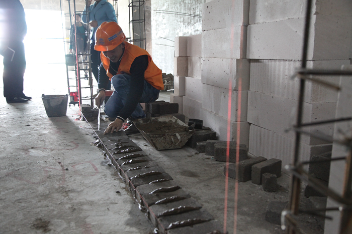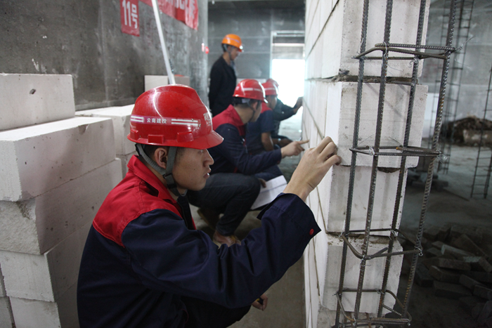 比賽當(dāng)天,在所有參賽選手進行安全教育及競賽相關(guān)注意事宜后,九點整,各參賽選手及其助手便各就各位,在海源財富中心項目6幢號上演了一場精彩的競技PK賽,經(jīng)過1個半小時的激烈比拼,其中的12個砌磚小組在規(guī)定時間內(nèi)完成了比賽內(nèi)容。本次競賽現(xiàn)場設(shè)有10名裁判進行現(xiàn)場監(jiān)督,并嚴(yán)格按照砌體結(jié)構(gòu)工程施工質(zhì)量驗收規(guī)范進行考核,從工藝、質(zhì)量、熟練度等方面進行綜合評比出優(yōu)勝者。