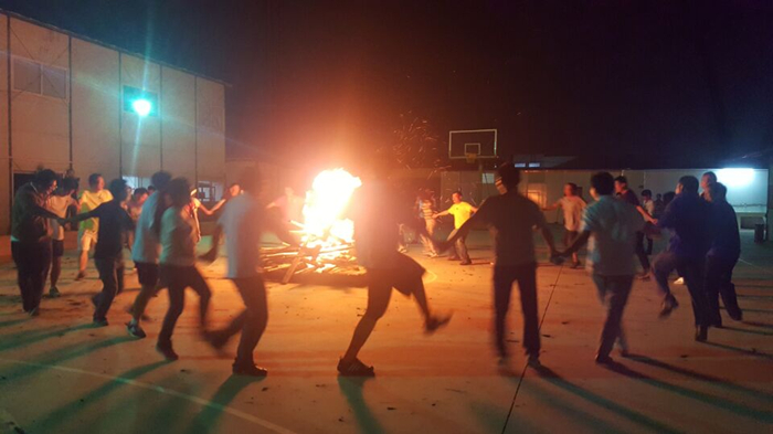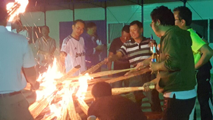 夜幕降臨,伴隨著激動(dòng)的心情火把節(jié)點(diǎn)火儀式開始了。天威云變項(xiàng)目部甲方、監(jiān)理及五〇八直管部天威云變項(xiàng)目部管理人員、海源財(cái)富中心項(xiàng)目部管理人員、二線職工共同舉起象征希望、幸福、健康的火把,點(diǎn)燃了項(xiàng)目球場(chǎng)中央的篝火。升騰的火焰將活動(dòng)推向高潮,大家圍繞在篝火旁,手拉手跳起熱情奔放的舞蹈《七月火把節(jié)》,現(xiàn)場(chǎng)一片歡騰。
