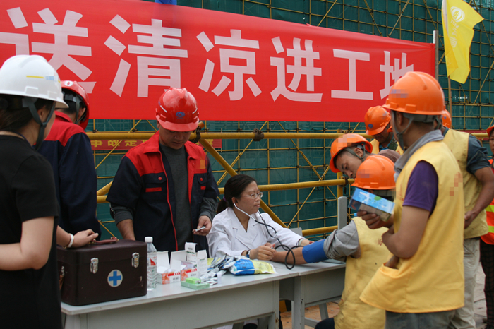 公司結合禁毒宣傳活動同時開展送清涼活動,退管會劉秀偉醫(yī)生免費為現(xiàn)場職工進行心臟、脈搏、血壓等常規(guī)體檢,開展了防流感咨詢,宣傳了高血壓、高血脂、糖尿病等常見慢性疾病的預防保健知識。公司工會、五〇八直管項目部、五〇四直管項目部、第三安裝直管項目部一同為項目管理一線管理人員和勞務班組人員發(fā)放小風扇、清涼茶、藿香正氣水、板藍根、風油精、清涼油、保濟丸等十幾種預防夏季高溫中暑的藥物。還發(fā)放了創(chuàng)可貼、醫(yī)用酒精、棉球等日常外用藥品和200盒計生用品。