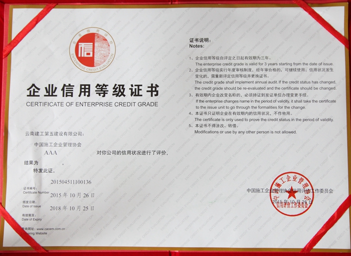 11月26日,中國施工企業(yè)管理協(xié)會在北京召開“中國工程建設(shè)誠信企業(yè)推介大會”。公司在此被評選為2015年度中國工程建設(shè)誠信典型企業(yè),并被授于“中國工程建設(shè)企業(yè)社會信用等級AAA級”牌匾、等級證書及獲獎證書。