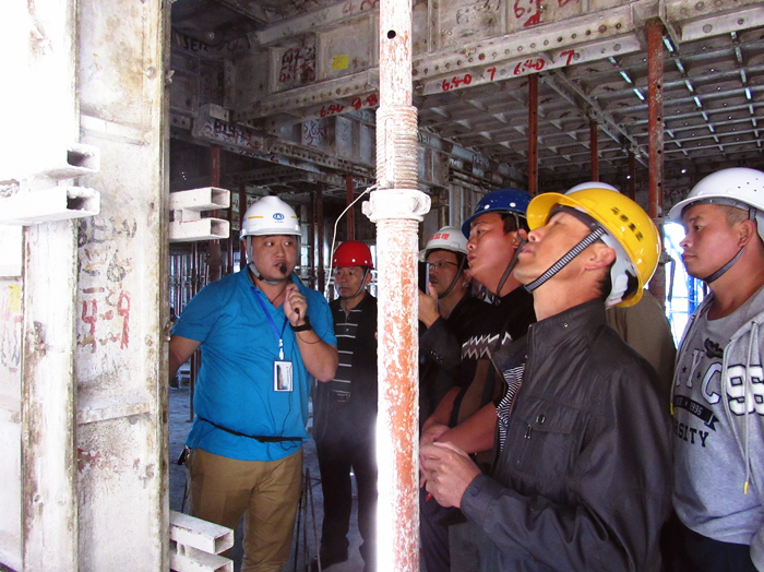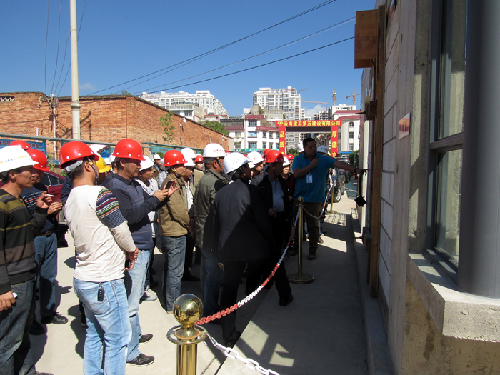 活動(dòng)中,龍潤(rùn)園項(xiàng)目的執(zhí)行項(xiàng)目經(jīng)理及項(xiàng)目總工通過ppt演示的方式對(duì)整個(gè)項(xiàng)目的亮點(diǎn)、特色及基本運(yùn)行情況做了介紹。隨后,觀摩組參觀了工序樣板區(qū)、現(xiàn)場(chǎng)在用鋁模、爬架及部分現(xiàn)場(chǎng)棟號(hào),執(zhí)行項(xiàng)目經(jīng)理對(duì)工程的質(zhì)量通病整治控制做了全面闡述。