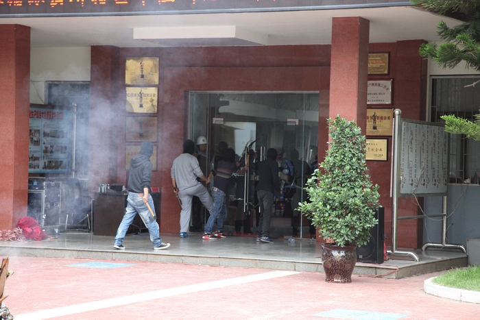 “黑林鋪派出所,黑林鋪派出所,五公司受到暴恐襲擊,請火速支援,請火速支援!”8月15日上午10點多,一輛面包車突然沖進公司大門,車上跑下來四名手持長刀及斧頭的蒙面“恐怖分子”,公司保衛(wèi)部立即組織職工撤回機關(guān)辦公樓進行防御,并第一時間請求黑林鋪派出所進行支援。