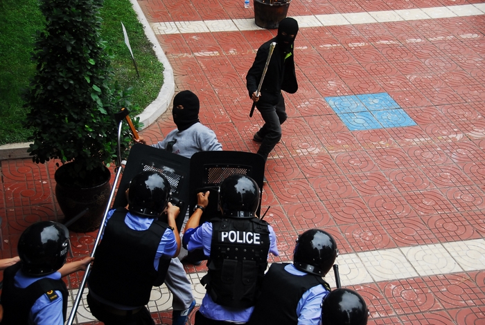 暴恐分子猛擊辦公樓大門及窗戶,并開始縱火、打砸物品。2分鐘后,黑林鋪派出所的特勤人員趕到案發(fā)現(xiàn)場,迅速組織兩隊人馬從兩側(cè)面包抄,公司保衛(wèi)部從正面出擊,在三隊人員的密切配合下,最終擊斃兩名暴恐分子,一名被擊中腿部,另一名則棄武器投降。