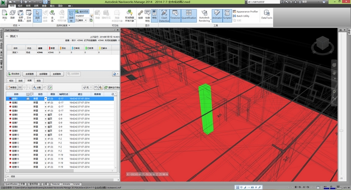 在集團組建了BIM工作站后,公司技術(shù)中心按照要求于2014年4月正式成立了BIM工作室,目前建模人員2人(土建專業(yè)1人,水電專業(yè)1人)。公司根據(jù)BIM技術(shù)運用的特點和新開項目實際,選取保山醫(yī)院門診樓項目作為首個BIM技術(shù)研究的試點工程,并于2014年5月1日開始模型繪制,至同年6月30日完成模型初稿繪制,耗時2月,分專業(yè)、分系統(tǒng)完成工程信息模型的建立,在模型碰撞檢查中發(fā)現(xiàn)43946個碰撞,其中真實碰撞點25000余個。