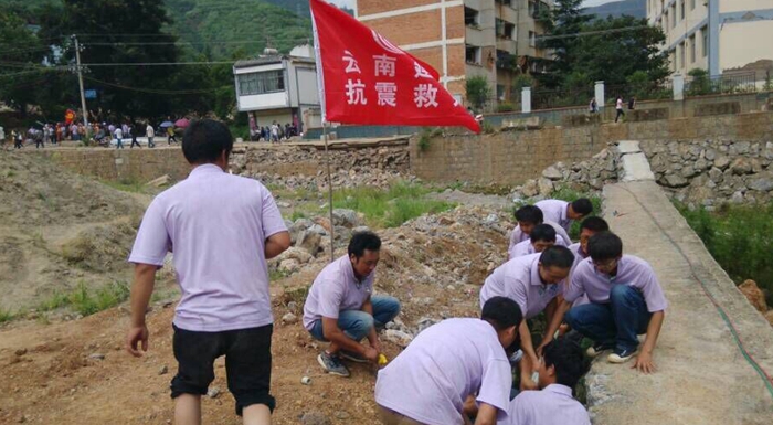 項(xiàng)目部組織了近30名管理人員和班組骨干人員,調(diào)集相關(guān)的機(jī)械設(shè)備和救援物資,將“云南建工抗震救災(zāi)”的標(biāo)語(yǔ)貼于車身前,于8月4日10:00時(shí)趕赴災(zāi)區(qū),10:40到達(dá)魯?shù)橹翞?zāi)區(qū)路口時(shí),由于前方道路實(shí)行交通管制以保證救援車隊(duì)及救護(hù)車輛通行,項(xiàng)目管理人員遂棄車步行35公里,于當(dāng)晚19:00時(shí)抵達(dá)震中龍頭山鎮(zhèn)后,不顧疲勞、忍著饑餓,馬上投入了搶修輸水管道、對(duì)相關(guān)受災(zāi)人群進(jìn)行問(wèn)候和發(fā)放物資的工作中,為抗震救災(zāi)貢獻(xiàn)一份力量。截止8月5日下午14時(shí)許,項(xiàng)目部人員仍堅(jiān)守在災(zāi)區(qū)最前線,繼續(xù)抗震救災(zāi)。