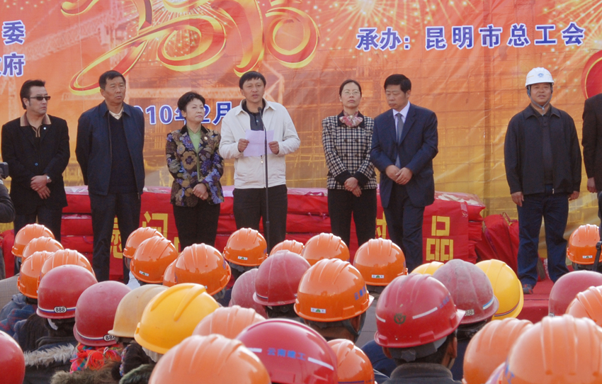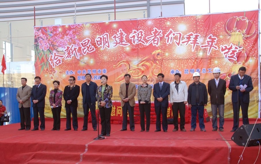 2月4日上午,受昆明市委、市政府委托,昆明市總工會主席楊麗等領(lǐng)導(dǎo)同志率團到云南建工第五建設(shè)有限公司昆明工人文化宮建設(shè)工地,給包括農(nóng)民工在內(nèi)的新昆明建設(shè)者拜年,給建設(shè)者送來新春的祝福和溫暖的禮品。楊麗主席和工會干部以及昆明市楓葉職工藝術(shù)團的演員們分別獻上精彩的歌舞。