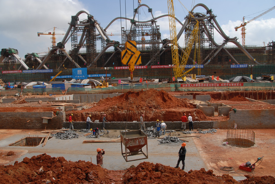 四臺嶄新的塔吊,不停地吊運著現(xiàn)場所需的各種物資;挖掘機在緊張地進行土方作業(yè);基礎承臺施工有序進行;三個鋼筋加工車間正在制作基礎工程鋼筋……