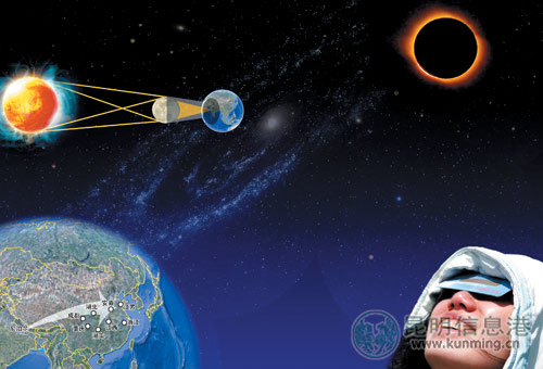 22日我國將出現(xiàn)500年一遇的大日食奇觀,據(jù)中科院紫金山天文臺(tái)預(yù)報(bào),這次日食是從1814年至2309年在中國境內(nèi)全食持續(xù)時(shí)間最長的一次日全食,最長可超過6分鐘。 據(jù)了解,云南地區(qū)觀測此次日食的時(shí)間為7月22日早上8點(diǎn)左右——10時(shí)左右。位于滇西的耿馬、滄源、瑞麗等城市是云南地區(qū)最早能看到日食的地方,滇東北的威信、水富相對(duì)晚5分鐘左右。 此外,云南僅有德欽縣可以看到日全食,其他地區(qū)僅能看到日全食發(fā)生的部分過程。 據(jù)預(yù)測,德欽初虧(日偏食開始)時(shí)間為8點(diǎn)03分23秒,食既(日全食開始)時(shí)間為9點(diǎn)04分24秒,食甚(日食中心時(shí)刻,即月球中心距離太陽中心最近時(shí)間)時(shí)間為9點(diǎn)06分28秒,生光(日全食結(jié)束)時(shí)間為9點(diǎn)08分31秒,復(fù)圓(日偏食結(jié)束)時(shí)間為10點(diǎn)17分24秒。 昆明能觀測到日食的時(shí)間為8點(diǎn)03分到10點(diǎn)22分,食甚時(shí)間為9點(diǎn)09分,食甚時(shí)食分為0.88,也就是說食甚時(shí)太陽的88%部分被遮住了。 據(jù)了解,此次全球性日全食,全食帶從印度西部開始,經(jīng)過印度、尼泊爾東南端、孟加拉國極北端、錫金、不丹、緬甸極北端、中國、太平洋西部,在大洋洲東部結(jié)束。我國境內(nèi)是最佳觀測地,從初虧至復(fù)圓長達(dá)3小時(shí)40分鐘,我國可完美欣賞到持續(xù)時(shí)間為6分39秒的日全食。 全食帶寬度可達(dá)250公里,自西向東經(jīng)過西藏南部、四川中部、湖北南部、河南南部、安徽南部、江蘇南部、浙江北部和上海等省份,幾乎覆蓋長江流域,有些城市可以觀看到日全食的時(shí)間將持續(xù)6分鐘,預(yù)計(jì)我國有3億人可以看到。 |