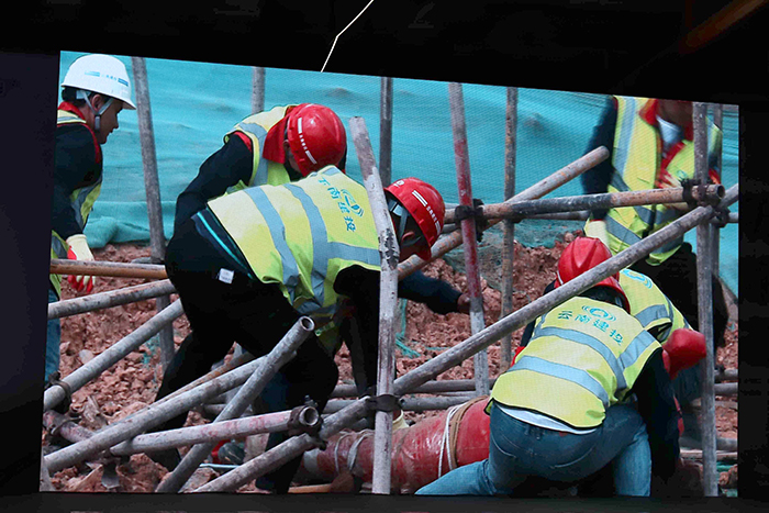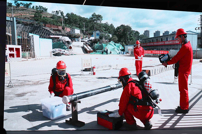 盤龍區(qū)安全生產(chǎn)委員會辦公室主任、應(yīng)急管理局局長楊勇宣布活動正式開始?;顒右砸曨l在線連接的方式,在現(xiàn)場演示了抗震救災(zāi)、消防安全、反恐及基坑腳手架坍塌事故四個應(yīng)急救援。其中,抗震救災(zāi)模擬了項目部在發(fā)生地震時人員組織疏散、現(xiàn)場被困人員救援、市政燃?xì)饣A(chǔ)工程極影搶修等情景;消防安全以項目部電動車起火為事件背景,逐一展現(xiàn)了事故上報、現(xiàn)場安全管制、火災(zāi)救援等過程;反恐演練模擬項目部有三人持刀闖入并砍傷現(xiàn)場人員的場景,檢驗突發(fā)情況下,項目部與政府部門之間的協(xié)同合作能力、應(yīng)急能力與救援能力;基坑腳手架坍塌應(yīng)急救援演練以事故發(fā)生后1名工作被架體材料掩埋為場景,演示了現(xiàn)場救援和應(yīng)急處理過程。
