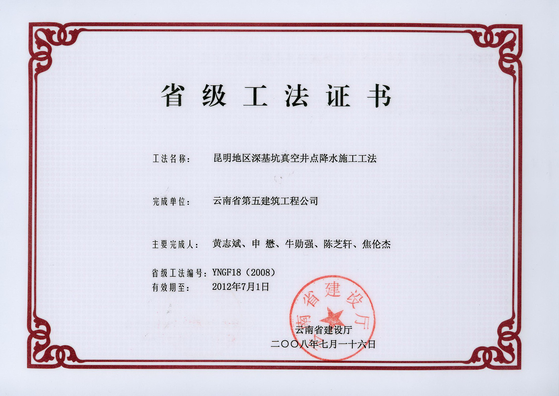 云南五建編制的省級(jí)工法——昆明地區(qū)深基坑真空井點(diǎn)降水施工工法