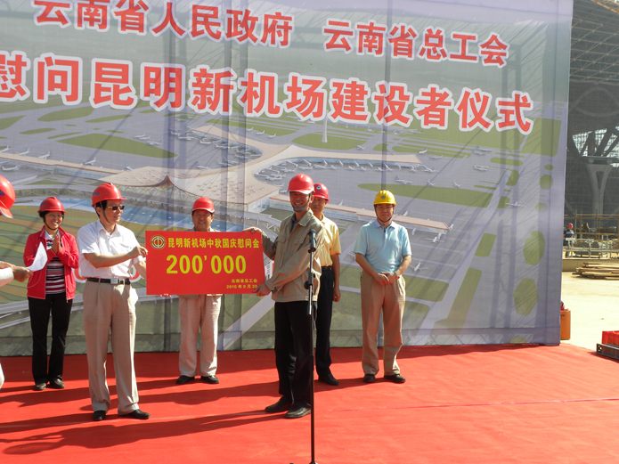 盧正國(guó)代表云南省委、省政府、省總工會(huì)像大家?guī)砉?jié)日的問候和祝福,向指揮部頒發(fā)了200000元慰問金。他說,昆明新機(jī)場(chǎng)是十一五國(guó)家重點(diǎn)項(xiàng)目,它的建成和運(yùn)行是我省開發(fā)西南橋頭堡戰(zhàn)略的重要舉措,希望各參建單位認(rèn)真貫徹省委、省政府提出的要求和方針,在昆明新機(jī)場(chǎng)建設(shè)中發(fā)揮工人階級(jí)主力軍作用。