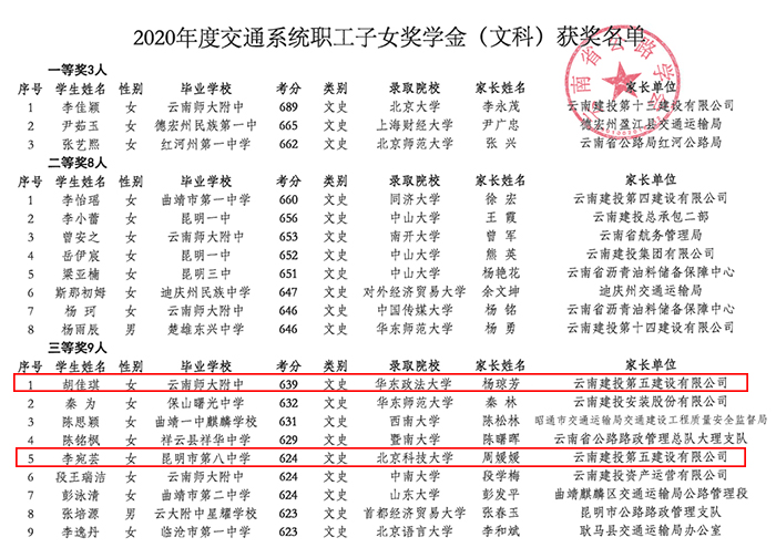 9月11日,2020年度云南省公路學(xué)會(huì)職工子女考入重點(diǎn)院校獎(jiǎng)學(xué)金評(píng)審結(jié)果發(fā)布,公司申報(bào)的兩名職工子女分均獲得文科類三等獎(jiǎng),獲得獎(jiǎng)學(xué)金1200元。 2020年職工子女獎(jiǎng)學(xué)金理工類申報(bào)評(píng)獎(jiǎng)的起點(diǎn)線定為625分,文史類申報(bào)評(píng)獎(jiǎng)的起點(diǎn)線為620分,并被重點(diǎn)院校錄取的交通系統(tǒng)(含外系統(tǒng)公路學(xué)會(huì)團(tuán)體會(huì)員單位)職工子女考生中擇優(yōu)評(píng)獎(jiǎng)。安一部職工楊瓊芳女兒胡佳琪,以高考成績647分...