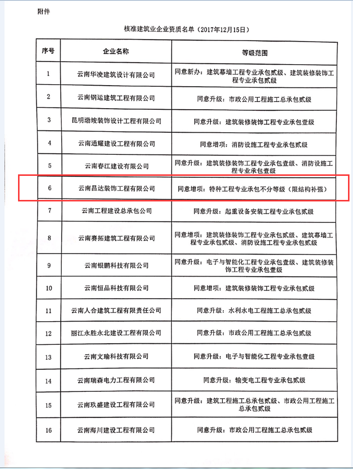 根據(jù)云南省住房和城鄉(xiāng)建設(shè)廳12月15日公示,云南昌達(dá)裝飾工程有限公司增項(xiàng)特種工程專業(yè)承包不分等級(jí)(限結(jié)構(gòu)補(bǔ)強(qiáng))資質(zhì)。 此次資質(zhì)的成功增項(xiàng),進(jìn)一步提升了昌達(dá)公司的市場(chǎng)競(jìng)爭(zhēng)力,為昌達(dá)今后在特種專業(yè)承包市場(chǎng)領(lǐng)域的開(kāi)拓和發(fā)展創(chuàng)造了良好的條件。昌達(dá)公司將繼續(xù)發(fā)揮優(yōu)勢(shì),組織實(shí)力團(tuán)隊(duì),積極參加有影響力的項(xiàng)目投標(biāo),不斷提升昌達(dá)業(yè)務(wù)水平。 ...