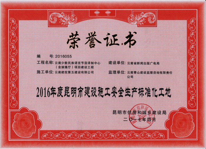 公司榮獲昆明市2016年度建設(shè)企業(yè)安全生產(chǎn)和工程質(zhì)量管理“先進(jìn)單位”榮譽