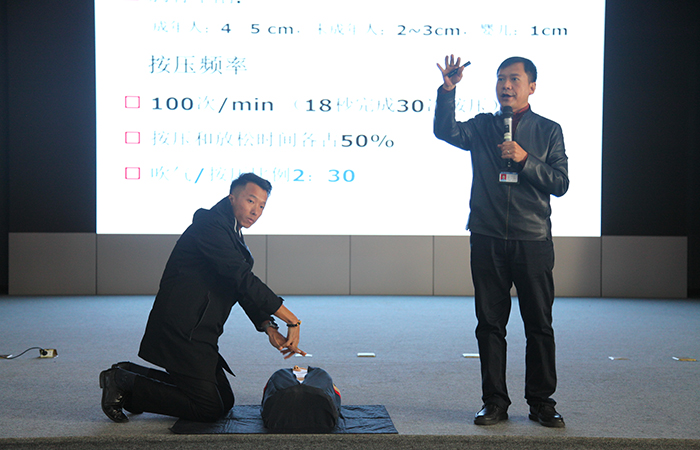 1月15日,公司人力資源部組織職工開展安全健康宣教培訓(xùn),特別邀請中國安全健康教育中心主任武宏宇授課,100名公司職工參與培訓(xùn)。 “工作時,遇到突發(fā)中暑、外傷的情況如何急救?”“游泳時,遇到溺水突發(fā)情況如何自救互救?”武宏宇利用PPT,結(jié)合生動實(shí)例,將可能會遇到的突發(fā)事件及有效急救措施向大家進(jìn)行介紹,并重點(diǎn)講解了 “心肺復(fù)蘇”、“人工呼吸”、“猝死”等常用的急救知識和技能…