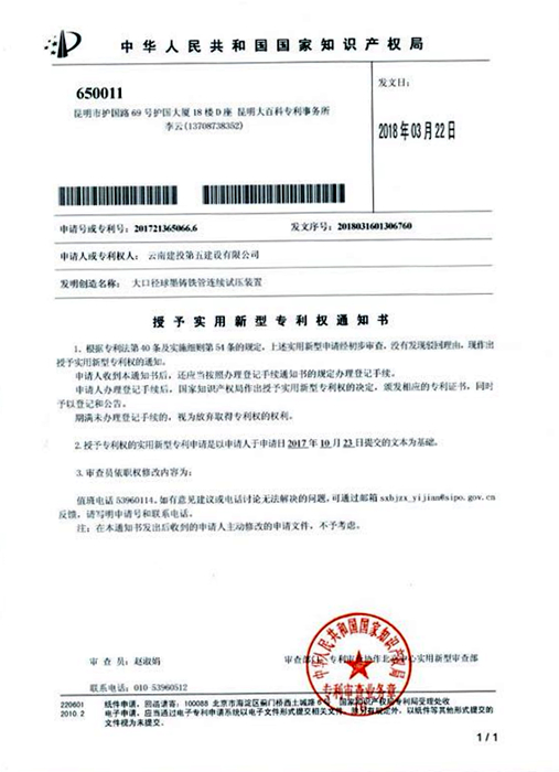 3月22日,第一安裝直管項(xiàng)目部在公司相關(guān)部門的指導(dǎo)下,榮獲國家實(shí)用新型專利《大口徑球墨鑄鐵管連續(xù)試壓裝置》。 在大理三庫連通項(xiàng)目的施工過程中,如何給1.2米的大口徑球墨鑄鐵管進(jìn)行試壓是第一安裝直管項(xiàng)目部面臨的一大考驗(yàn)。在聽取了多個(gè)設(shè)計(jì)單位、生產(chǎn)單位的建議后,揉合以往的相關(guān)經(jīng)驗(yàn),直管部研發(fā)出一套滿足試驗(yàn)要求的“連續(xù)試壓裝置”。工程項(xiàng)目竣工之后,直管部積極總結(jié)施工經(jīng)驗(yàn),...